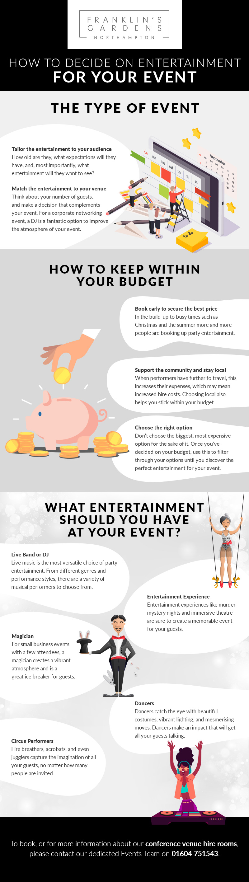 Once you’ve established your budget, it can be tricky to stick within it once you’ve begun booking everything you need. When you start looking at your event entertainment, it’s easy to go over budget if you don’t have a clear plan. To help you remain under your budget, follow our guide below, so you can host an unforgettable event without breaking the bank: