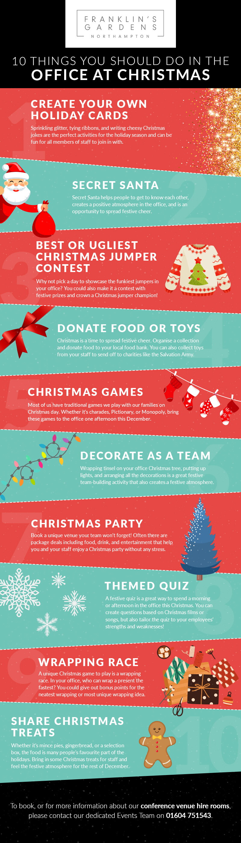The classic Christmas game, Secret Santa is one of the most fun parts of the working year. Pick names out of a hat, making sure everyone’s included, and pick a day for the team to share their gifts. Secret Santa helps people to get to know each other, creates a positive atmosphere in the office, and is an opportunity to spread festive cheer.