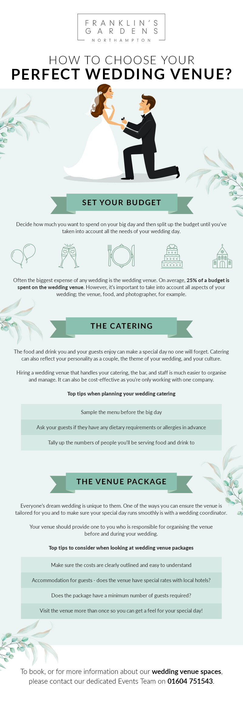 The right wedding venue package should have clear costs that are easy to understand. For example, at Franklin’s Gardens, our packages are based on cost per person based on minimum numbers for your chosen package. There is a cost for ceremony hire depending on your chosen room and the number of guests. Having clear costs takes the stress away from hiring your dream wedding venue.